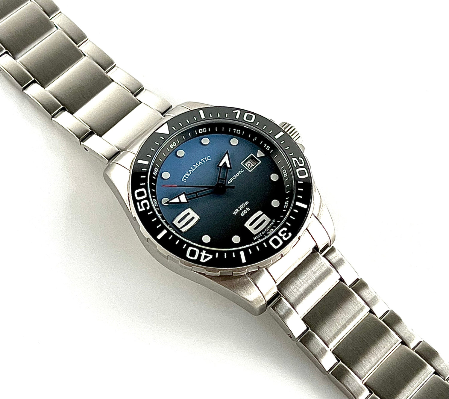 - blau-schwarzes Zifferblatt, Indices und Zeiger, sowie Zahlen der Keramiklünette im Dunkeln stark leuchtend für hervorragende Ablesbarkeit