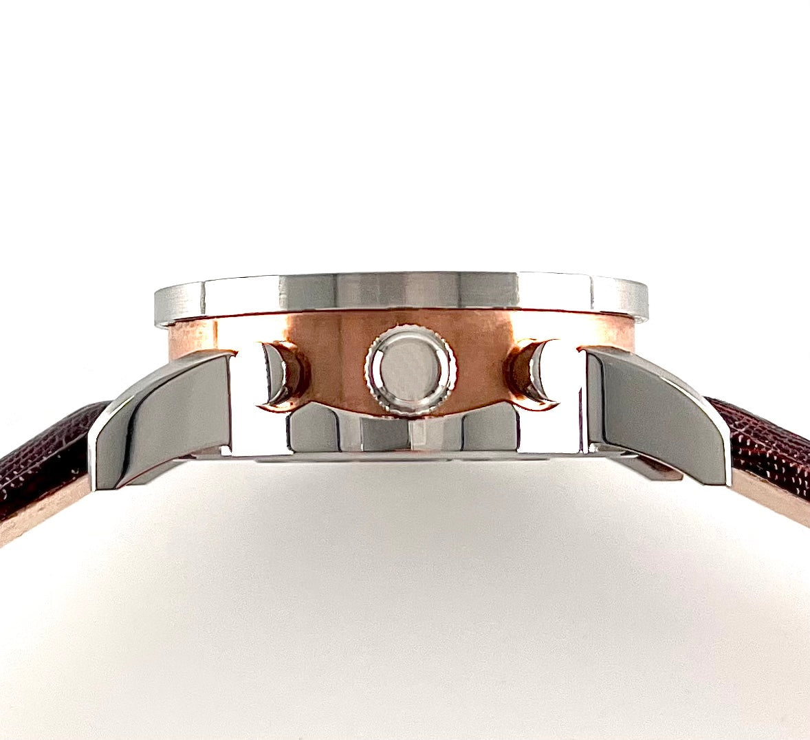 - 3teiliges Edelstahlgehäuse aus 316 L Uhrmacherstahl, Topring und Mittelgehäuse poliert, Unter-Gehäuse mit Bandanstößen satiniert, Mittelgehäuse und Faltschließe rose`vergoldet